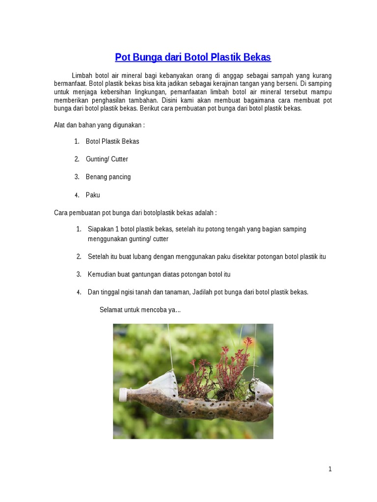 Jika sudah cat potongan botol yang telah dibentuk dengan cat akralik dengan warna dasar. Dan bisa menggantungkannya pada taman dengan meletakkan bunga yang segar. Beberapa ide untuk menangani sebuah limbah plastik, sebagai berikut : Lalu bersihkan secara khusus dulu bagian lengketnya. Hal yang pertama bisa dilakukan dengan memanfaatkan botol plastik sisa. Dan tinggal ngisi tanah dan tanaman, jadilah pot. Cara pembuatan pot bunga dari barang bekas botol minuman: Siapkan pola gambar karakter lucu yang akan tempatkan pada botol plastik. Lepas plastik yang masih menempel pada botol plastik. Kemudian buat gantungan diatas potongan botol itu. Gambar pola pada botol plastik lalu potong dengan gunting sesuai dengan gambar polanya. Buanglah label merek pada botol air mineral dan bersihkan botol. Nurlatifa dinas pendidikan provinsi jawa barat sma negeri 1 parigi jalan babakan ardiyasa no.